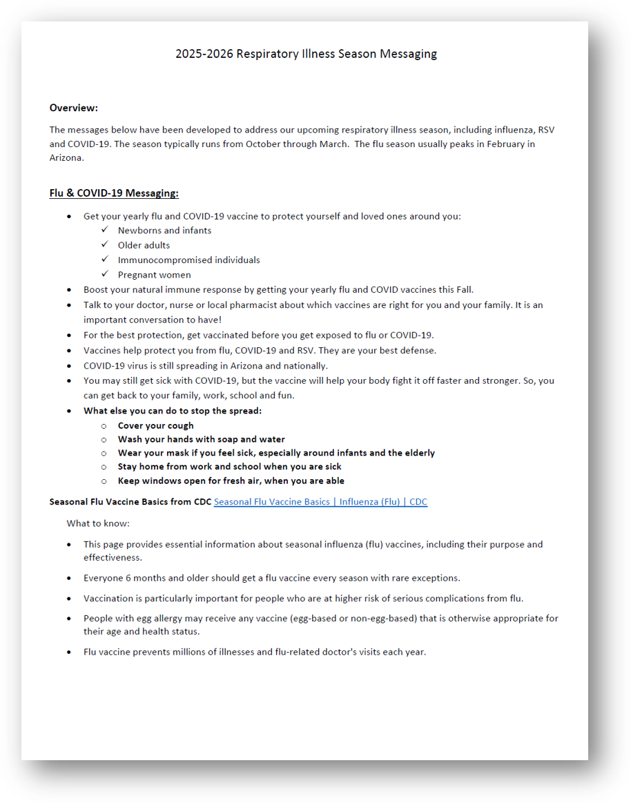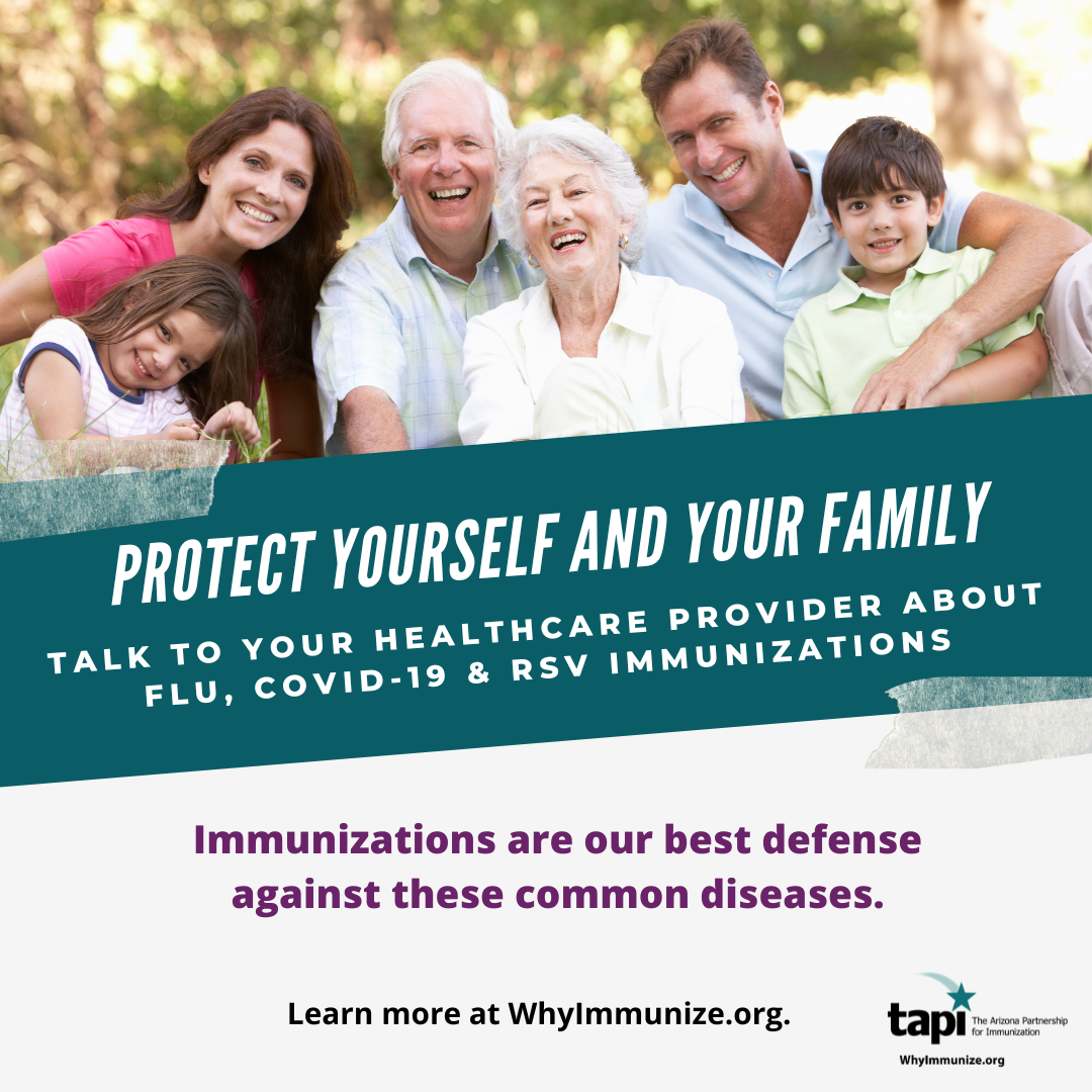 The Arizona Partnership for Immunization has developed a variety of resources to support your outreach efforts. Below are downloadable social media graphics and messaging for you to utilize. Our respiratory illness flyers and posters are are available to download or order on our website page at whyimmunize.org/recursos.